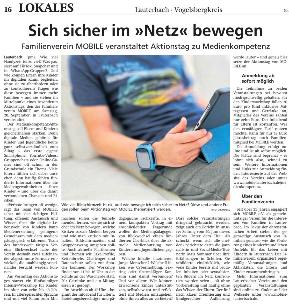 „Sich sicher im Netz bewegen: Familienverein MOBILE veranstaltet Aktionstag zu Medienkompetenz“; Pressebericht im Lauterbacher Anzeiger | 14.08.2025