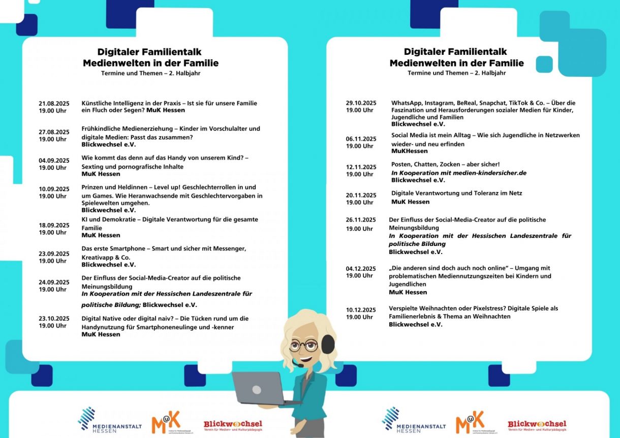 „Digitaler Familientalk“ wird im Auftrag der Medienanstalt Hessen, Tel.: 0561 93586-0, E-Mail: info@medienanstalt-hessen.de, auch im Jahr 2024 vom Institut für Medienpädagogik und Kommunikation Hessen (MuK Hessen) und dem Blickwechsel e. V. – Verein für Medien- und Kulturpädagogik angeboten.